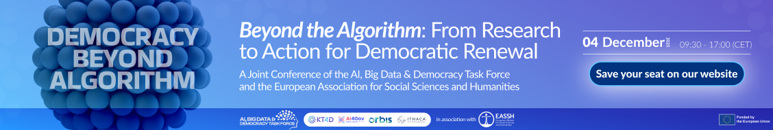 Beyond the Algorithm: From Research to Action for Democratic Renewal is a hybrid event jointly organised by the Horizon Europe KT4D, ORBIS, ITHACA and AI4GOV projects. The event puts under the spotlight the rapid deployment of Artificial Intelligence and Big Data technologies and how these these technologies hold the promise of fostering civic participation, transparency, and efficiency in democratic governance. Yet, they also introduce new risks related to algorithmic bias, privacy infringements, disinformation, cultural polarisation, and the erosion of democratic values.